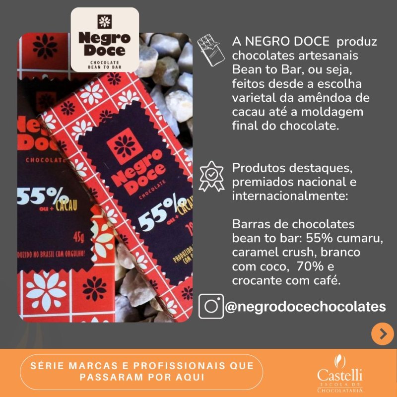 Today, chocolate maker and owner of Negro Doce, of Bean to Bar chocolates, in Caxias do Sul (RS), whose chocolates have already won several awards: Bronze at the International World Awards, 2023, coffee brittle, GOLD at the Americas International Awards, caramel crush 2021, gold The Chocolate Alliance Awards 2020 (inclusions category with her 55% Cocoa with Tonka Bean), bronze and silver at the Bean to Bar Brasil award 2018-2019 in the dark chocolate category (70% to 80% cocoa) and at the Academy of Chocolate 2019,2020,2021,2023, with her 45% milk chocolate, 50% coconut milk, white, coconut flakes and 70% Brazil blend.