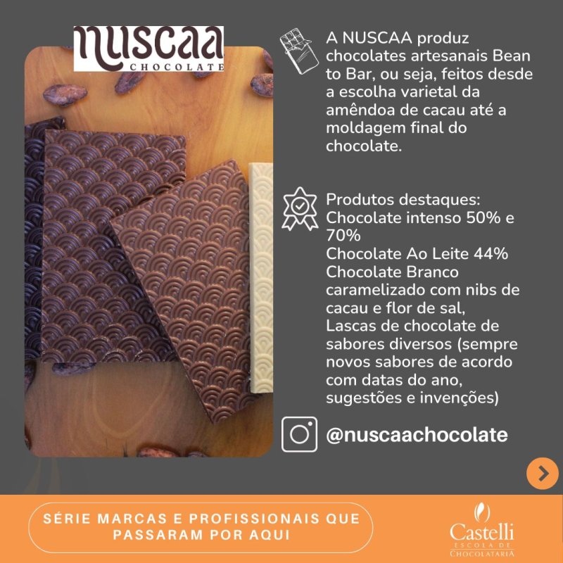 Nuscaa is a small chocolate factory with a big dream: to take the full potential of Brazilian chocolate to your palate, respecting the entire chain, from fruit to bar.