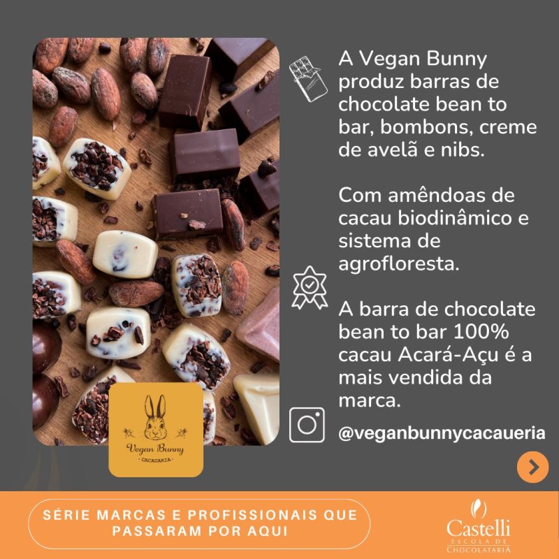“The Castelli school played a fundamental role in my success trajectory in chocolatry. The course I took provided me with in-depth knowledge and essential practices that elevated the quality of my products. I learned from the best in the cocoa segment, met fantastic teachers, with whom I keep in touch to this day, and other students who became friends and business partners. Today, every bar I produce carries this history of dedication and love for true chocolate.”